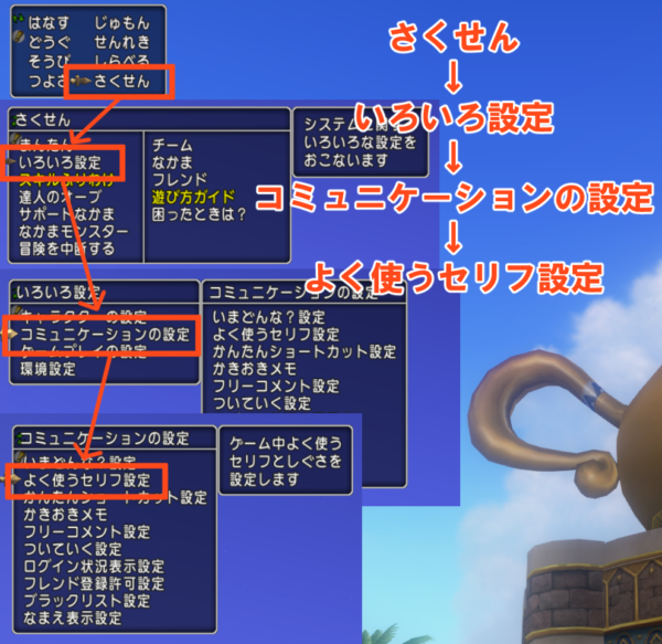 「さくせん→いろいろ設定→コミュニケーションの設定→よくつかうセリフ設定」