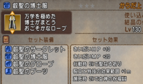 守備力が高く、行動時に祈りと瀕死時に女神が確率で発動する叡聖セット。