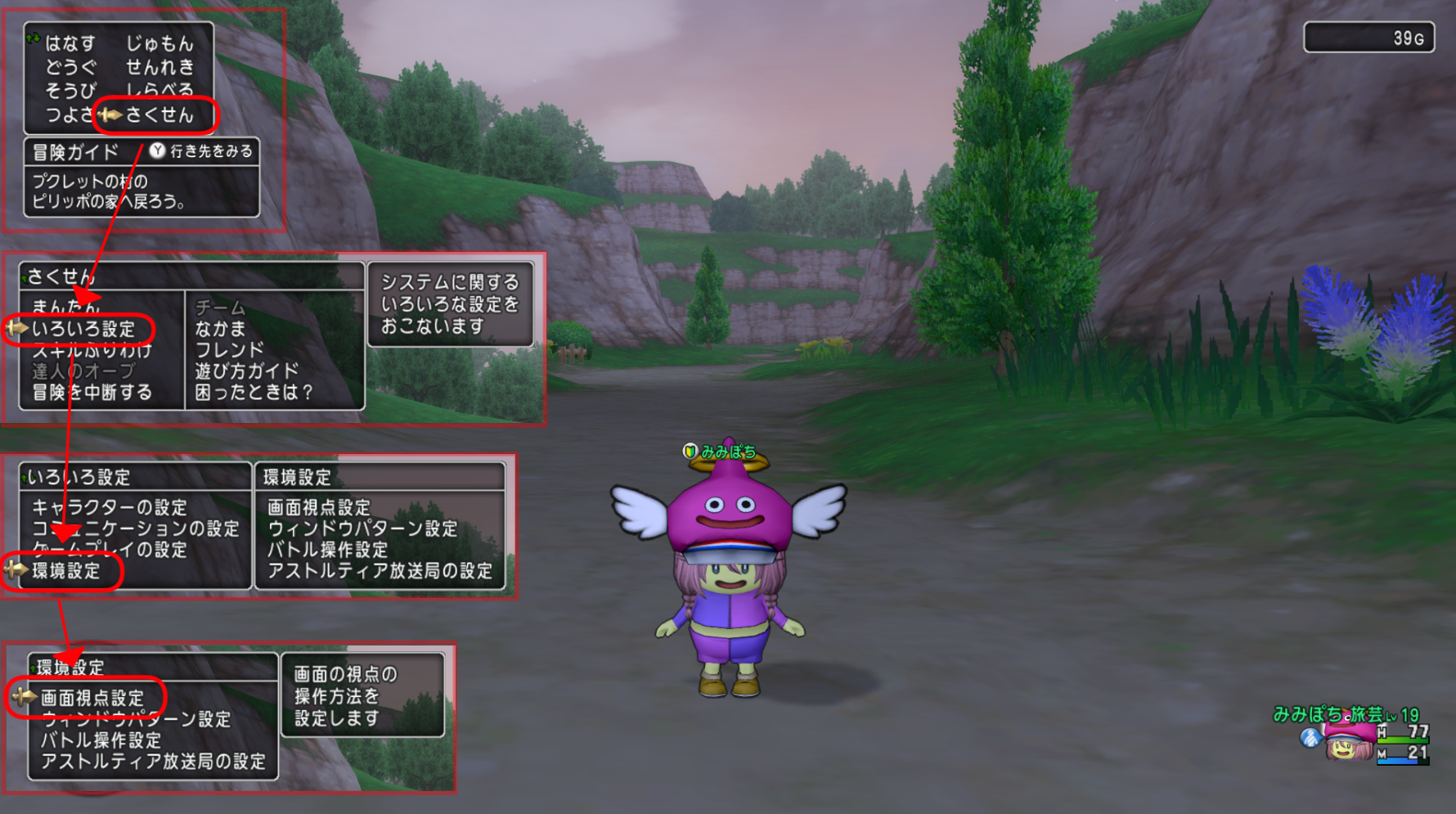 機能とはちょっと違うかもですが、ゲームが始まったら早めに「画面視点の設定」をしておくといいでしょう。