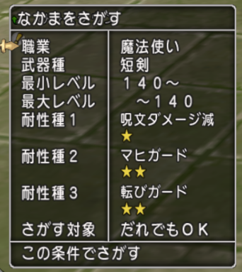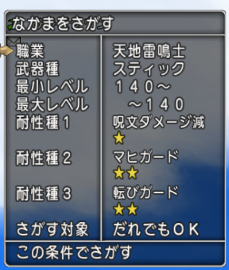 天地は盾を持てるので、『呪文★・マヒ・転び』の検索で絞れます。